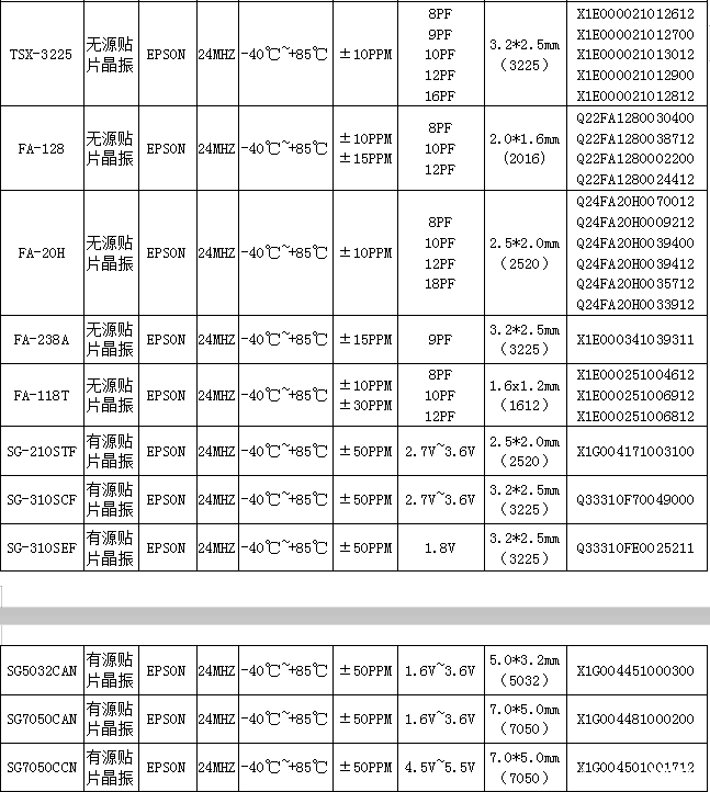 • 汽車電子用EPSON晶振晶體規格一覽表