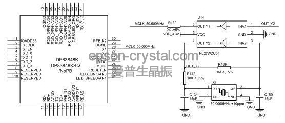 當客戶M3352_YP做外圍電路時,如需要使用百兆以太網功能,需要外加PHY電路,PHY芯片通常可以選擇DSZ8041或者DP83848,在使 用RMII接口時,無論選擇何種型號的PHY芯片,都需要為PHY芯片提供一路50MHz的CLK信號。為了降低成本可以采用50.000M晶 體+NL27WZU04的方式為PHY提供50.000M的時鐘源。